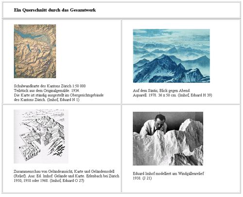Über 100 anklickbare Bilder von Karten, Panoramen und Gemälden, versehen mit fachlichen Kommentaren, geben einen eindrücklichen Überblick über das Gesamtwerk von Eduard Imhof. Das Inhaltsverzeichnis gliedert den Inhalt in 12 interaktiv anwählbare Kapitel. Es kann auf eine kurze Biographie mit zahlreichen Links zugegriffen werden. Und will jemand die Originale sehen oder in den Fachschriften von Imhof die Kenntnisse vertiefen, ist im bibliographischen Anhang ersichtlich, wo die Dokumente gefunden werden können. Mit einem Mausklick kann so die ganze Welt das Werk unseres berühmten Kartographen und Künstlers ansehen.
